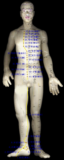 Меридиан желудка относится к группе ЯН, парный симметричный. Энергияк нему поступает от меридиана толстой кишки и передается на меридиан селезенки — поджелудочной железы. Начинается с середины орбиты глаза и идет вниз, доходит до центра десны верхней челюсти, огибает губу и соприкасается с одно именным меридианом. После этого направляется к углу нижней че люсти, огибает губу и соприкасается с одноименным меридианом. По сле этого направляется к углу нижней челюсти, где в точке 5 делится на два направления: головное и туловищно-ножное. Головное — доходит до угла нижней челюсти, поднимается вверх, проходит от уха по передней волосистой части виска до лба (на 1,5 см внутрь от лобного угла волосистой части головы). Туловищно-ножное — от точки 5 спускается вниз на шею, доходит до надключной ямки, проходит по сосковой линии груди, опускается по поверхности живота до лобковой кости и через середину паховой складки переходит на переднюю поверхность бедра. Далее, снаружи от колена, идет по голени и заканчивается на наружной поверхности второго пальца стопы в точке 45.