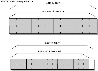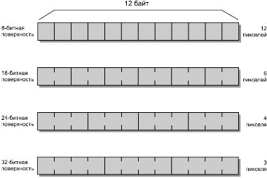Поскольку в каждом пикселе беспалитровой поверхности находятся реальные цветовые данные, необходимо знать, в каком формате хранятся отдельные пиксели поверхностей. Формат пикселя описывает способ хранения красной, зеленой и синей (RGB) составляющих. Он зависит от глубины пикселей, видеорежима и аппаратной архитектуры. Форматы пикселей подробно рассматриваются в главе 5.