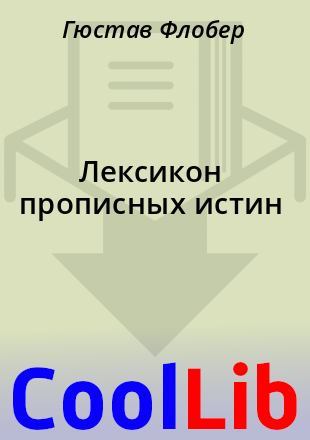 Гюстав Флобер Лексикон прописных истин Vox populi — vox Dei[1]. Народная мудрость Не подлежит сомнению, что всякая общая мысль, всякая общепризнанная условность — бессмыслица, ибо они — достояние большинства. Шамфор. «Изречения»Сборник тонких мыслей А Абеляр — Иметь какое-либо представление об его философии или же знать названия его произведений не обязательно. — Скромно намекнуть, что Фюльбер его изуродовал. — Могила Элоизы и Абелара; если вам станут доказывать, что она не подлинная, воскликните: «Вы лишаете меня иллюзий!» Абрикосы — И в этом году их у нас ещё не будет. Абсент — Чрезвычайно сильный яд. — Убил больше солдат, чем это сделали бедуины. Автор — Необходимо «быть знакомым с авторами», нет надобности знать их имена. Адвокаты — В Палате слишком много адвокатов. — Их суждения лживы. ...