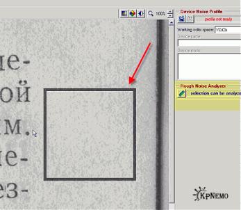 На этом этапе мы должны выбрать участок скана, где нет букв и рисунков, но есть характерные шумы. Обратите внимание: темные полосы около корешка или на краях тоже не должны попасть в наш выбор. На выделенный участок показывает стрелка на Рис. 1: