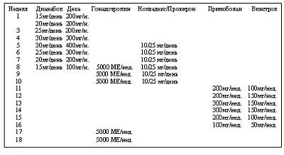 5. Для повышения выработки эндогенного тестостерона атлет принимает, с одной стороны, ХГТ, который прямым и быстрым воздействием стимулирует половые клетки яичек, а также Кломид, который оказывает более полное воздействие на дугу «гипоталамус-гипофиз-яички», приводя ее вновь в действие, но за более длительный промежуток времени. Прием ХГТ начинается в последние недели прекращения приема стероидов. При этом атлет вводит себе 3 инъекции по 5000 ЕД каждые три дня. В заключение — еще 3 инъекции по 5000 ЕД каждые 5 дней. После 3 инъекций ХГТ начинается прием Кломида, т. к. его гонадостимулирующее действие лучше проявляется при заранее активированном усиленном действии яичек.