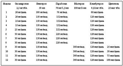 Кломид (кломифенцитрат, клостильбегит) изначально нельзя принимать в дозах более 50 мг ежедневно, т. е. более 1 таблетки. Не будем забывать, что препарат имеет химическую формулу эстрогена. В малых дозах он просто блокирует действие эндогенных эстрогенов, т. к. перекрывает им доступ внутрь клетки, занимая белки-каналы клеточных мембран. В больших дозах он уже начинает действовать как эстроген. Лично я рекомендую атлету любого веса начать с приема 1 т. в день и через 2 недели перейти на прием ½ т. в день, т. к. чувствительность организма к препарату повышается. Старые профессора, у которых я учился, не спешили каждый день менять больным лекарства. Если какое-то лекарство не помогало, они сначала пробовали понизить дозировку, иногда даже несколько раз подряд. И только тогда, когда снижение дозировки не давало никакого эффекта, использовали повышение дозировок либо совсем отменяли лекарство, заменяя его другим. В результате таких наблюдений я получил бесценный опыт подбора дозировок, которым и пользуюсь всю жизнь. К женщинам пункт 5, естественно, не относится.