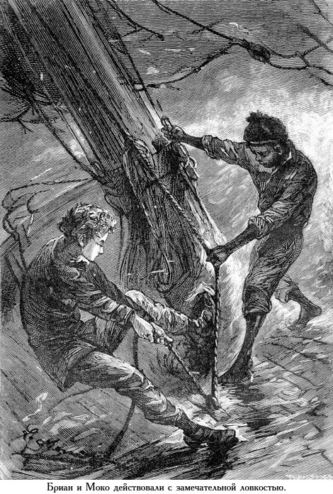 В подобных условиях Бриан и Моко действовали с замечательной ловкостью. Решив во что бы то ни стало сохранить часть паруса, чтобы держать судно по ветру, пока продолжается буря, они сумели отдать фал