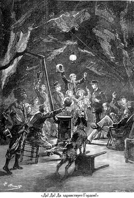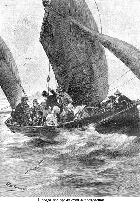 [26], который спустился на расстояние в четыре-пять футов от поверхности палубы. Тогда мальчики отрезали ножом клочья разорванного фока и закрепили его нижние концы на костылях фальшборта