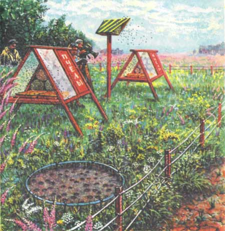 Микрозаказник среди полей эспарцета в научном городке ВАСХНИЛ под Новосибирском. «Квартиры» пчел-листорезов, ближе — подземная колония пчелок-рофитов.