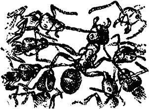 Черных лазиусов истребить труднее. Они устраиваются и живут порой в самом центре крупных городов. Бывает, что как раз над гнездом проходит дорога. То и дело затаптывается вход, сотрясаются подземные галереи, многие муравьи находят смерть под колесами автомашин и подошвами пешеходов, но муравейник, обновляемый с удивительным упорством, живет. Поищите внимательно: быть может, и вам посчастливится найти таких муравьев-горожан и их гнезда. Если увидите хотя бы единственного муравья, знайте: где-то неподалеку есть муравейник. Исключений из этого правила нет — муравьев-одиночек не бывает.