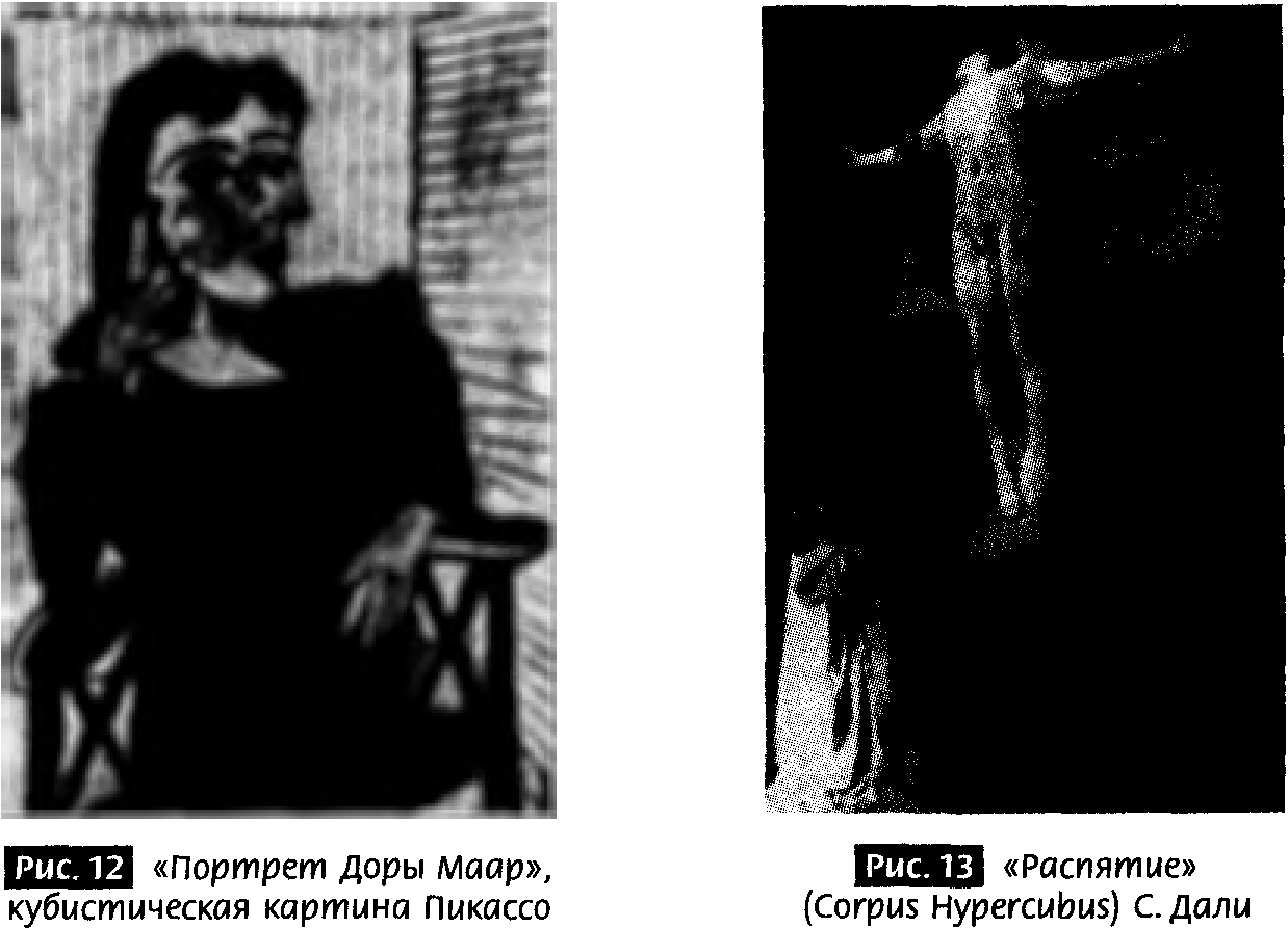Пример квазикристаллической картины показан на рис. 2. В ней нет точной регулярности, встречающейся в настоящем кристалле, картина которого выглядела бы скорее как сетка, нанесенная на лист миллиметровки. Наиболее изящный способ объяснения картин расположения молекул, возникающих в этих странных материалах, использует проекцию — нечто вроде трехмерной тени — кристаллической картины в пространстве с большим числом измерений, которая отражает симметрию картины в многомерном пространстве. В сковородах с антипригарным покрытием, на рабочую поверхность которых нанесены квазикристаллы, используется тот эффект, что проекция многомерных кристаллов на поверхности сковороды имеет структурные отличия от земной структуры обычной трехмерной пищи. Различные расположения атомов, не дающие им связаться друг с другом, являются дразнящим намеком на то, что дополнительные измерения существуют и объясняют ряд наблюдаемых физических явлений.