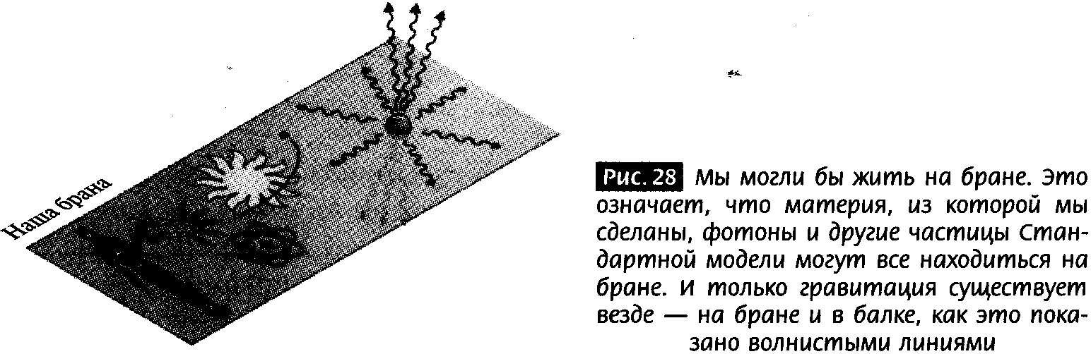 Я объясню физические принципы, лежащие в основе этих и других теоретических достижений, и новые представления о пространстве, делающие их допустимыми. Далее мы столкнемся с еще более фантастической возможностью, которую годом позднее обнаружили физик Андреас Карч и я: возможно, мы живем в трехмерном кармане пространства, хотя вся остальная Вселенная ведет себя так, как будто у нее большее число измерений. Этот результат открывает массу новых возможностей для структуры пространства-времени, которое может состоять из отдельных областей, каждая из которых имеет разное число измерений. Мы не только не находимся в центре Вселенной, как пять столетий тому назад сказал Коперник, но, возможно, живем в изолированной области с тремя пространственными измерениями, являющейся частью многомерного космоса.