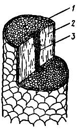 Рис. 2. Поперечное сечение волоса: 1 - наружный слой (кутикула), 2 - корковый слой, 3 - сердцевина