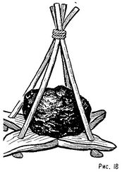 Конструкции древних якорей из дерева и камня были различны, хотя их принцип одинаков. Оригинально устройство якоря, показанного на рис. 16. Большой плоский камень удерживается четырьмя жердями с отходящими от них срезанными еловыми ветками. Жерди скреплены между собой веревками или ивовыми прутьями. Такими якорями пользовались во время рыбной ловли древние обитатели Сибири-ханты, манси и кеты. На рис. 17 показан якорь, которым пользовались древние рыбаки с о. Шри-Ланка (Цейлон), а якорь, изображенный на рис. 18, служил индейцам Бразилии.