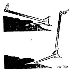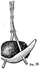 Конструкция якоря, изображенного на рис. 19, срисована с подлинных экспонатов Британского музея в Лондоне. Эти якоря были найдены в разное время в разных местах Англии. Фактически это тоже крестовина, сделанная наполовину из камня. Здесь продолговатый, закрепленный между двумя палками, камень служит рычагом, переворачивающим при натяжении веревки якорь на бок, на один из двух концов доски, который под действием веса камня заглублялся в грунт.