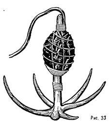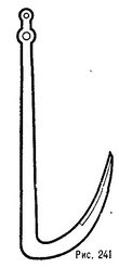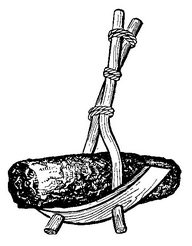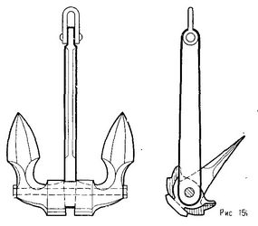 Следующее усовершенствование якорного камня — конструкция, показанная на рис. 11 и 12, — крестовина из заостренных сучьев, утяжеленная одним или несколькими просверленными камнями. В этой конструкции уже сочетается принцип действия крюка, который заглубляется в грунт, и груза. В какой стране и у какого народа якорный камень с крестовиной появился раньше, сказать трудно. Археологические раскопки в различных уголках земного шара свидетельствуют: подобные якорные камни применялись в разных частях света. Камень с крестовиной был распространен от западных берегов Европы до восточных берегов Азии и на побережье обеих Америк. Подобный якорь хранится в Лувре. В глубокой древности он служил рыбакам Японии (рис. 13). Он почти ничем не отличается от якорей, изображенных на рис. 14 и 15. Каких-нибудь двести лет назад их использовали на океанских каноэ индейские китобои с острова Ньюфаундленд.