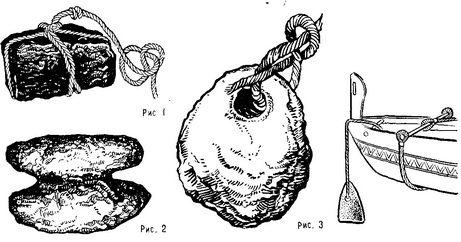Первым усовершенствованием якорного камня стал желоб (канавка), сделанный по окружности, чтобы веревка или лиана не соскальзывала с гладкой мокрой поверхности (рис. 2). Более надежно — просверленное в камне отверстие. Такой якорный камень, показанный на рис. 3, нашел известный советский археолог А. Я. Брюсов во время раскопок в низовье реки Суны в Карелии в 1929 г. Эта интересная археологическая находка относится к 2000 г. до н. э. Сейчас она хранится в Государственном Историческом музее в Москве.