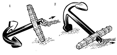 Но груз, привязанный к веревке, — еще не якорь в современном смысле этого слова, ибо удерживающая способность (произведение держащей силы на вес якоря) современных якорей в десятки раз превосходит их собственный вес. А у камня, лежащего на дне, удерживающая способность меньше его веса. Поэтому назовем камень с привязанной к нему веревкой «якорным камнем».