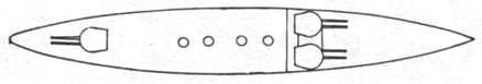 Затем Комитет обсуждал проект под номером “4”, в котором при нормальном водоизмещении 16950 т основные размерения крейсера составляли 164,4 х 23,2 х 7,93 м. Проект возвращался к установке восьми 305-мм орудий в четырех двухорудийных башнях. Из них по одной башне расположили в диаметральной плоскости на полубаке и в корме корабля и еще две на главной палубе в ряд поперек диаметральной плоскости в районе миделя корабля в общей цитадели (обычном редуте). Высота осей стволов орудий над уровнем нормальной ватерлинии составляла для носовой башни 10,4 м, средних башен 9,14 м и кормовой башни 6,4 м. Такое расположение башен обеспечивало по шесть орудий в носовом, бортовом и кормовом залпе. Рассмотрев этот вариант. Комитет без колебания решил, что, так как идеальное размещение артиллерии главного калибра, допускающее ведение одинаково сильного как бортового, так и продольного огня, невозможно, то следует больше уделять внимание сильному бортовому огню, по сравнению с продольным.