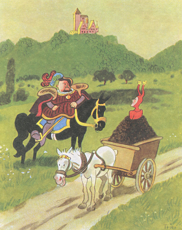 Уленшпигеля оттуда как ветром сдуло. Но скоро случилось так, что он опять решил проехать по земле этого герцога, потому что огибать её было бы слишком долго. Для этого он купил себе лошадь и повозку, а неподалёку от крепости Целле, проезжая мимо поля какого-то крестьянина, купил у него целую кучу земли, навалил её в свою повозку и зарылся в эту землю, так что снаружи остались только голова и руки. Так он стал погонять лошадь и направил повозку к владениям герцога. Проезжая мимо Целле, он повстречал на дороге самого герцога со свитой, спешащих на охоту.