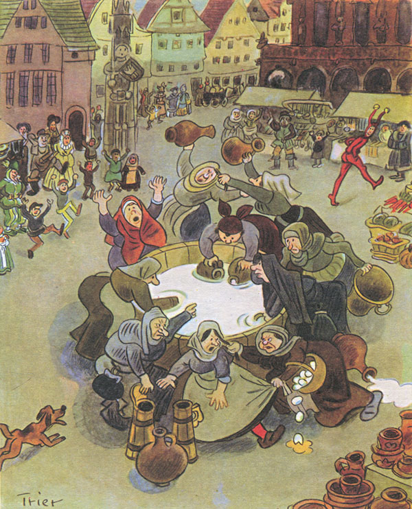 Тут поднялся такой крик, что в ратуше лопнули три окна. Все женщины со своими кастрюлями, бутылками, вёдрами толпой бросились к бочке. А так как каждая старалась опередить остальных, началась ужасная давка. Они колотили друг дружку вёдрами, в воздух летели молочные брызги и пачкали их одежду. В конце концов бочка опрокинулась, и молоко залило всю площадь — как будто прошёл молочный дождь.