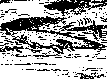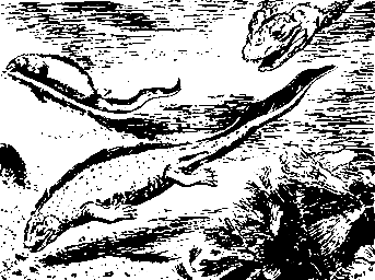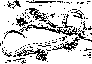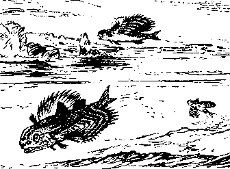 Наконец он достиг берега реки, которая образовывала большую и мелкую излучину. На илистом дне здесь отдыхало и грелось несколько двоякодышащих рыб ктенодов. Их плавательный пузырь был расположен во вспомогательном дыхательном аппарате, способном при необходимости обогащать кровь кислородом из воздуха. Челюсти этих рыбок состояли из зубов, превращенных в широкие трехсторонние пластинки с многочисленными зубчатыми щетками. Рыбки лежали без движения в прогретой воде, как будто неживые. Однако, когда они увидели вблизи страшного эдафозавра, заспешили так, что вода стала темной от взмученного ила, и исчезли в глубине.