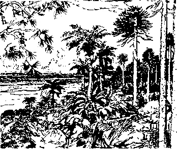 Успешно охотился урокордилус в зеленом полумраке под веерами папертников. Когда он насытился, ему захотелось отдохнуть. Поэтому он пробирался через сплетения зеленой поросли к берегу лениво текущей реки, воды которой вливались в обширный омут, соединенный проливами с другими омутами и болотами, благодаря чему вся эта область была удивительным лабиринтом и необозримым чередованием участков воды и болотистой суши.