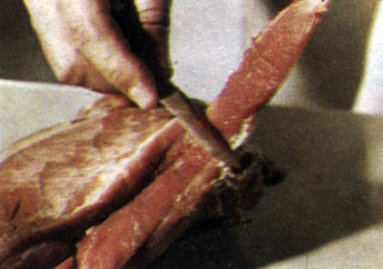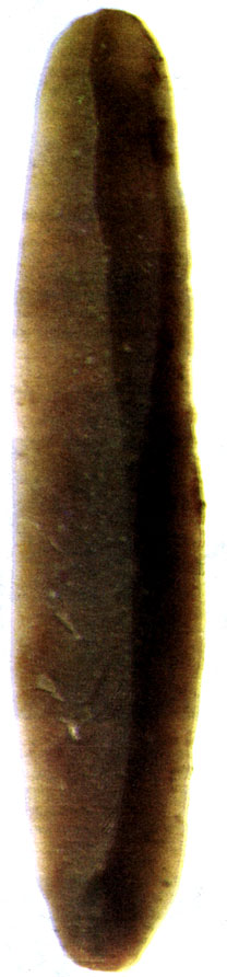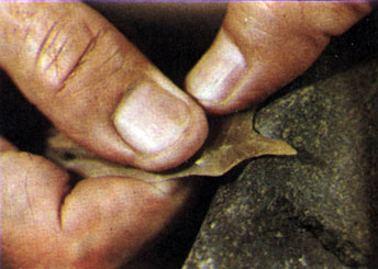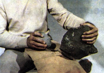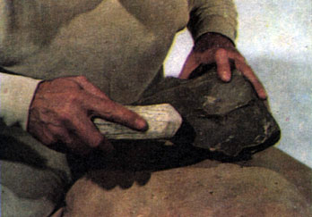 Пластины для серпа: Одним из последних величайших достижений в изготовлении каменных орудий в Старом Свете был микролит - небольшой кусок кремня с четкими углами, который нередко отбивался от пластины с острыми краями вроде изображенной вверху. Разломанная в заранее намеченных местах на три куска, как во втором ряду, такая пластина давала средний кусок е виде трапеции (два боковых куска в дело не шли) или, как в нижнем ряду, кусок, имеющий форму треугольника или сегмента. Затем эти микролиты можно было вставить (острым краем наружу) в деревянную или костяную ручку и укрепить их там смолой или каким-нибудь другим естественным клеем