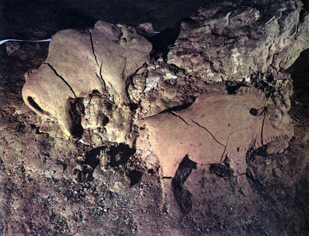 Два шестидесятисантиметровых глиняных зубра прислоняются к выступу известняка в дальней галерее французской пещеры Ле-Тюк-д'Одубер близ Арьежа. Фигуры эти, возможно, использовавшиеся для каких-то обрядов, были вылеплены около 15 тысяч лет назад, но почти не пострадали от сырости и колебаний температуры, которые разрушили не столь хорошо укрытые скульптуры
