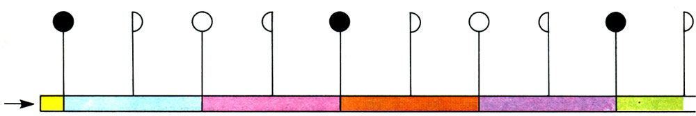 Разноцветная полоса наложена на кроманьонскую дощечку, чтобы выделить разные части извивающейся цепочки из 69 меток. На диаграмме лунных фаз полоса выпрямлена, чтобы показать, как Александр Маршек соотносит эти метки с моментами изменения фаз. Первая метка (стрелка на фотографии) соответствует последней ночи перед новолунием, когда луна становится невидимой (стрелка на диаграмме). Каждая последующая метка обозначает очередную ночь, и постепенно образуется запись изменений луны. Кривизна полосы, возможно, указывает на изменение точки появления луны в каждый последующий вечер