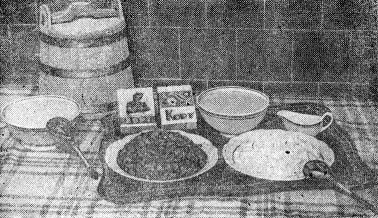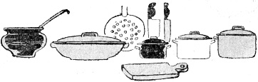 На кухне необходимо иметь: кастрюли различной емкости (от 4 до 10 литров) для варки супов, большие глубокие сковороды для выпечки паштетов и других пирогов, сковороду с ручкой для приготовления яичницы, чугун для варки супа в печи, чугунную гусятницу для жаренья и тушения птицы, чугунную кастрюлю с толстым дном или чугунок для приготовления плова. Кроме (того, необходимо иметь мясорубку, различные терки, тяпку для отбивания мяса, доску для резки мяса, рыбы и овощей, большую доску для выкладывания пирогов из печи, специальные ножи для резки мяса и очистки картофеля, решето, сито, скалку и доску для разделывания теста, деревянный пестик-толкушку, деревянную мешалку, цедилку, дуршлаг, различные ложки и другой инвентарь.