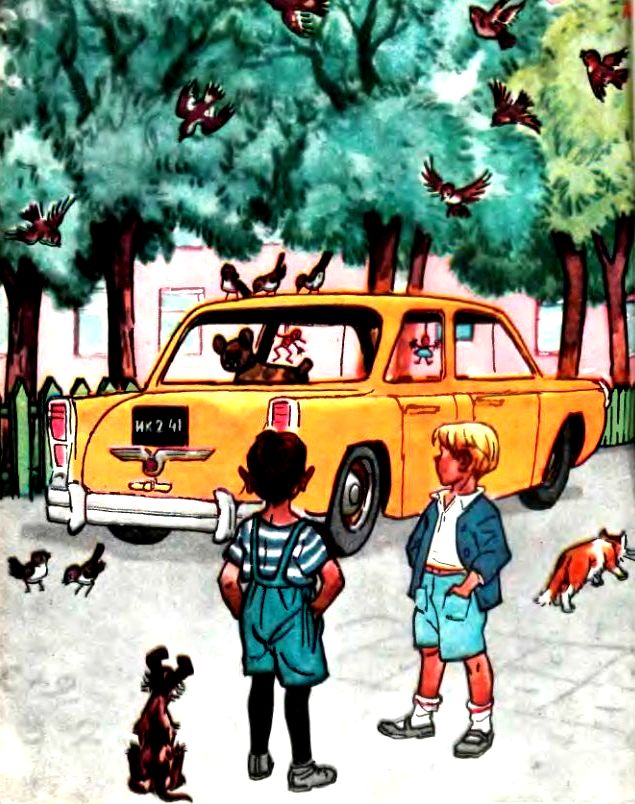 Тут пришёл шофёр и сел в машину. Мишка подбежал сзади, уселся на бампер и шепчет: