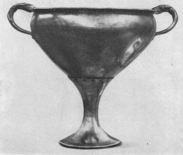 [29] Назовем прежде всего золотой кубок № 412 из могилы IV гробничного круга А в Микенах, который первоначально не имел украшений — и лишь позднее был украшен двумя фигурками птиц, — видимо, потому, что позднее появилась мода на орнаментированные подобным образом кубки.