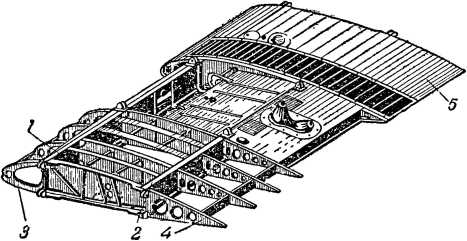Центральная часть крыла самолета ЯК-18: 1 — передний лонжерон (балка), 2— задний лонжерон, 3 — нервюра (ребро), 4 — хвостик нервюры, 5 — дюралюминиевая обшивка.