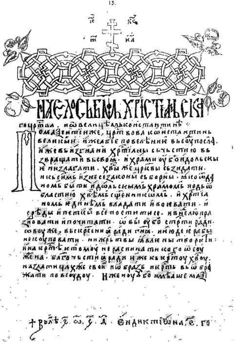 Цитаты из древних памятников даются в упрощенной орфографии. Из письменных знаков, отсутствующих в современном алфавите, сохраняются лишь буква ѣ и знак «титло», ставившийся над сокращенно написанным словом, например: ҃