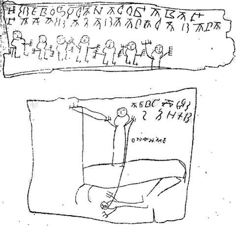 В 1949 г. под Смоленском около села Гнездово была открыта первая русская кирилловская надпись. Она была сделана в середине X в. на сосуде. Одни ученые читают ее как