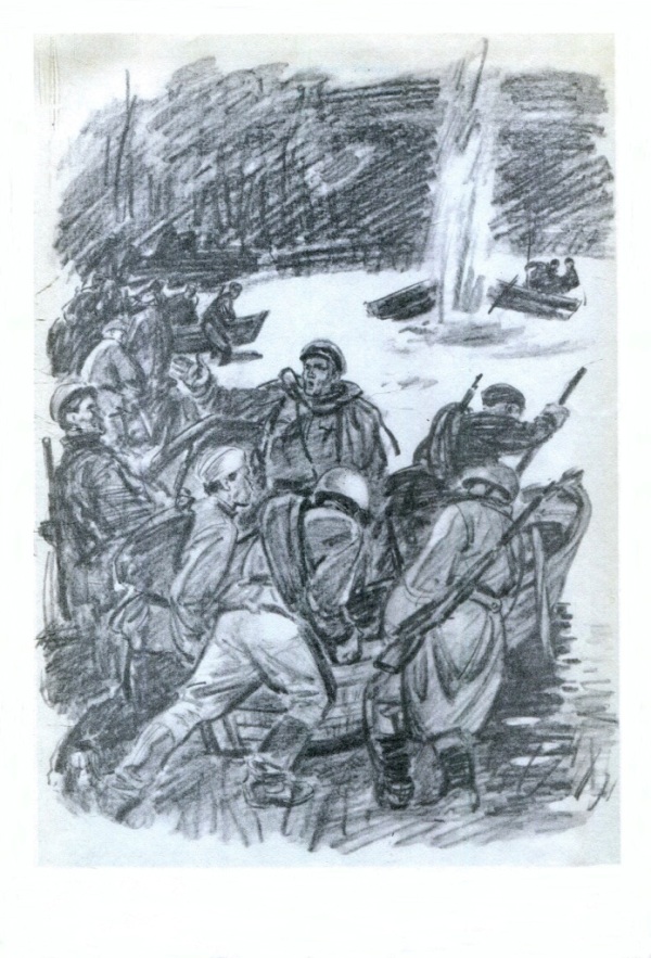Отлежав около месяца в Ленинграде, я был эвакуирован затем на Большую землю. Ночью санитарный поезд, набрав раненых и больных, после многих маневров и остановок, каким-то кружным путем достиг берега Ладожского озера. Нас, прикованных к носилкам, разместили на палубе небольшого парохода. Тронулись тихо, без огней. В глубине суденышка мягко постукивала машина, за бортом с шумными всплесками заструилась ладожская вода… Прощай, Ленинград!