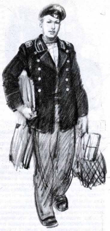 Портфель не взял, куплен в Перми. Но попросил студента за прилавком завернуть набор треугольников, рейсшину, чертежные лекала… Коллега сам добавил то, что я не догадался назвать: тушь, акварельные краски и кисточки, резинки «пуроль» и «радоль», перья «рондо» для подписывания чертежей, наконец, значок на фуражку — топор, перекрещенный с якорем, — который я, тут же и нацепил.