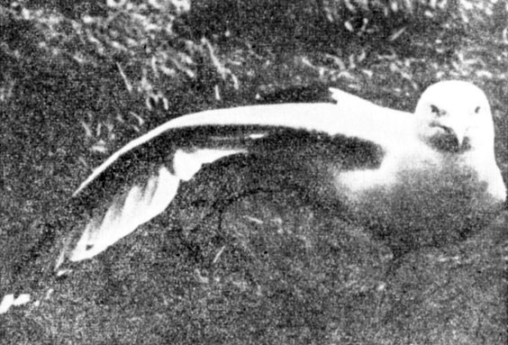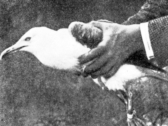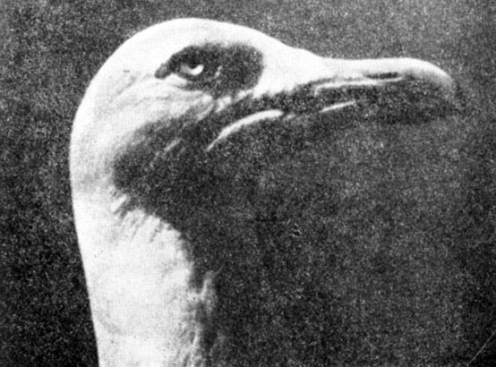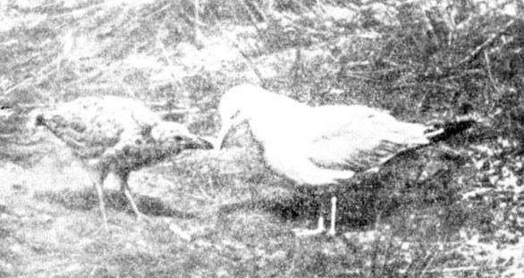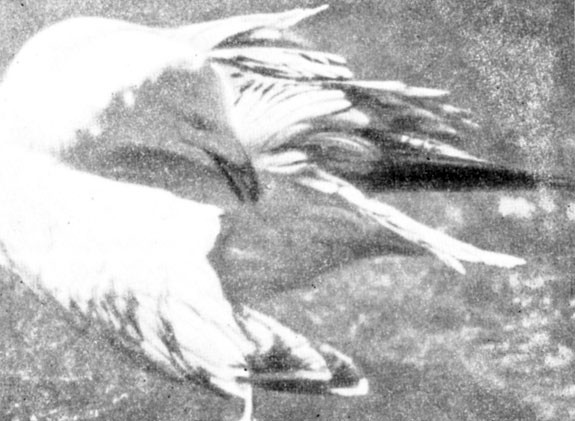 С другой стороны, назначение серебристо-белого оперения взрослой чайки все еще не разгадано. В последнее время было выдвинуто два предположения. Поскольку белый цвет оказался наиболее удачной маскировкой для самолетов, которые ведут поиски подводных лодок, Крейк [15] считает, что белый цвет столь многих видов чаек имеет покровительственное назначение, помогая им незаметно приближаться к рыбе. Но в то время как белый цвет "хищника", охотящегося за подводными лодками, оказывается действенным только на больших дистанциях, чайка остается невидимой для рыбы ц на довольно близких расстояниях. Во-первых, поле зрения рыбы ограничено полным отражением света от поверхности воды, а во-вторых, предметы, находящиеся в воздухе, она видит очень смутно из-за ряби на поверхности и строения глаз, приспособленных к "ближнему" зрению в подводных условиях.