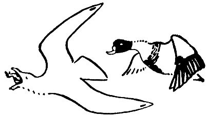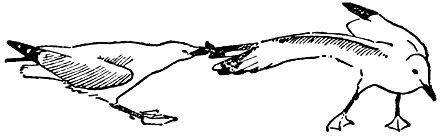 Чайки летают, плавают и ходят одинаково хорошо. Как правило, они не удаляются от побережья, хотя в этом отношении даже близкие виды чаек заметно различаются между собой. Серебристая чайка — птица гораздо более береговая, чем ее близкая родственница клуша (эта изящная птица нисколько не виновата в том, что носит такое название), но и она иногда улетает далеко в море. Хотя полет к не ее специальность, она владеет этим искусством достаточно хорошо, чтобы вызвать восхищение и даже зависть. Вот замечательный пример ее ловкости в воздухе. В колонии чистиков близ Бамптона, в Йоркшире, серебристая чайка стащила яйцо чистика. Когда она улетела с яйцом в клюве, за ней погналась другая серебристая чайка, и, не выдержав наскоков, первая птица выпустила свою добычу. Вторая чайка тут же повернула и, проделав стремительный маневр, успела поймать падающее яйцо за острый конец, после чего улетела с ним. Яйцо осталось целым и в конце концов было съедено второй чайкой. Весь маневр занял в вертикальном направлении не более 15 метров [50].