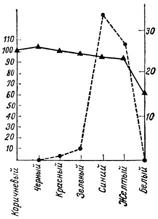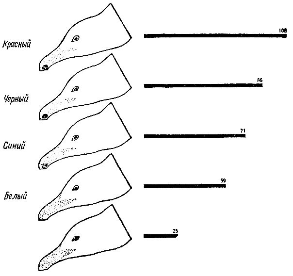 Кроме этих двух проблем, нас интересует и вопрос о различении цветов. Совершенно ясно, что птицы различают светлые и темные тона, но способны ли они различать и цвет? Позднее мы увидим, что серебристая чайка видит красный цвет, точнее — выделяет его из всех остальных Цветов той же яркости. Цветовое зрение легко поддается проверке. Необходимо только обнаружить, какую реакцию избирательно стимулирует определенный цвет, а потом установить, зависит ли воздействие этого цвета от его яркости. Экспериментальному животному для этого предъявляют мноя{ество одинаковых предметов, которые различаются только цветом или оттенком, например набор серых предметов различного тона — от почти черного до почти белого — или набор предметов одной и той же формы, но разного цвета. Если животное избирательно реагирует на °Дин какой-то цвет, то это может служить доказательством его способности различать цвета.