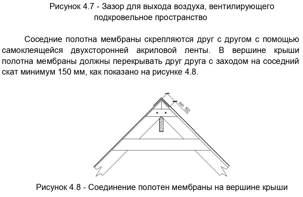 Между досками обрешётки соседних скатов, которые сходятся в вершине крыши, необходимо оставить зазор для выхода воздуха, вентилирующего подкровельное пространство (см. рисунок 4.7).