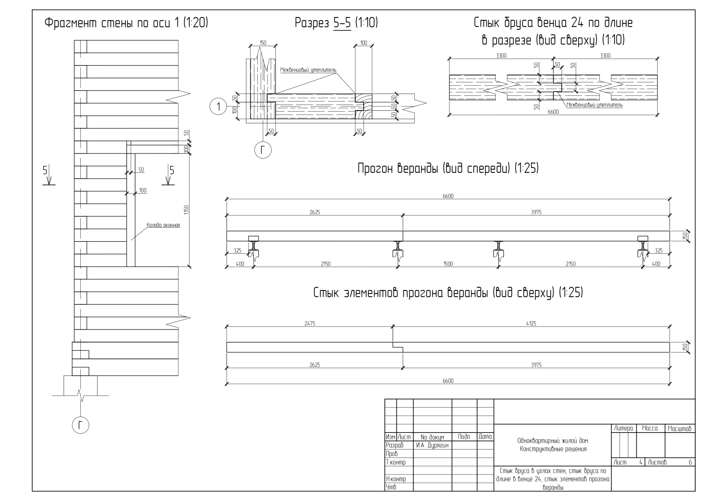 Брусья венца №24 по осям Б и Г являются составными по длине. В месте стыка брусьев используется соединение «шип-паз». Внутри соединения прокладывается джутовое полотно. Эти брусья выступают за плоскость стен по осям 1 и 3 на 325 мм для опирания на них крайних стропильных ног.