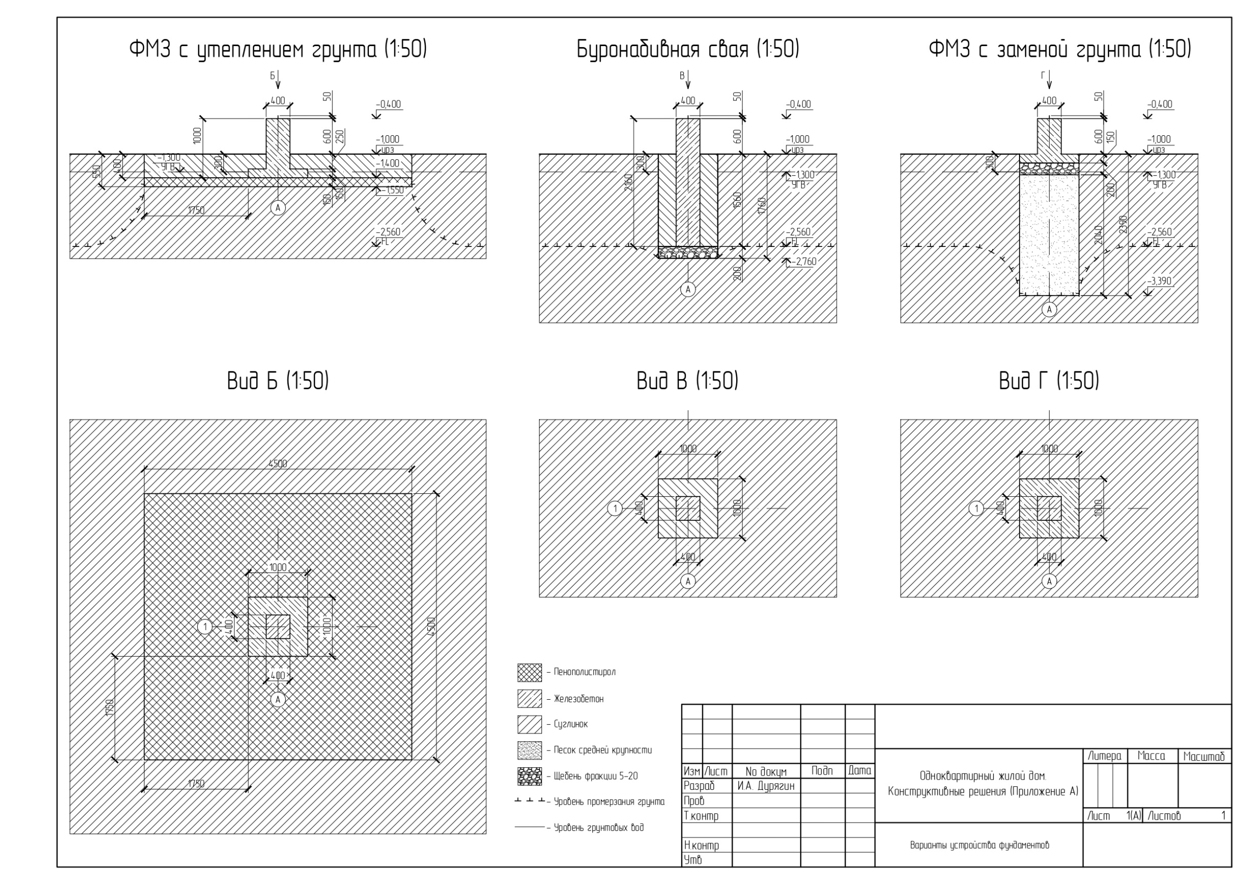 Рассмотрим 3 варианта устройства фундаментов для данных грунтовых условий:
