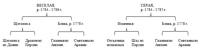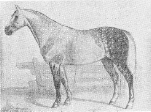 Вообще вопросы мастей были модными в XVIII веке. Старательно разводили лошадей любительских мастей и отмастков: соловых, буланых, розовых, чубарых, различного рода пегих, моренкопфов (чалых с черными головами), изабеловых и т. д. О том, что жеребцов-производителей следует выбирать после их испытания в езде, в работе, в скачках, — в книгах XVIII века мы не находим ни одного слова.