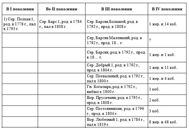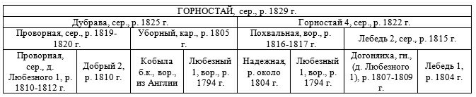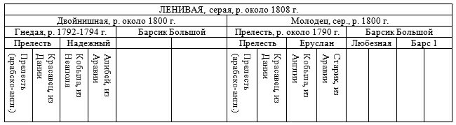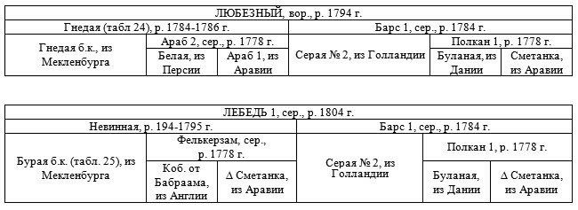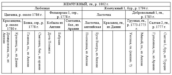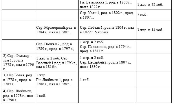 Когда год рождения лошади в приводимом списке указывается, например, 1792–1794 г… — это означает, что лошадь родилась не ранее 1792 года и не позднее 1794 года. Нумерация таблиц в скобках, например (табл. 8), дана по Зав. кн. 1847 года. На примере хотя бы Грузной легко показать, как восстанавливаются вероятные годы рождения для лошадей рысистого отделения, точных записей в отношении которых не сохранилось. Первая ставка детей Барса 1 была получена в 1792 году. Поэтому раньше чем в 1792 году Грузная родиться не могла. С другой стороны, Галку, свою дочь от Тромпетера на Англин, Грузная не могла приплодить позже, чем в 1800 году, так как к случному сезону 1800 года Тромпетер уже выбыл из завода и был заменен сыном, Тромпетером Молодым. Тем самым вероятный год рождения Галки падает на промежуток между 1798 и 1800 годом, а вероятный год рождения Грузной окончательно определяется между 1792 и 1794 годом, так как дополнительно следует учесть, что дочери Барса 1 задерживались в езде и обычно поступали в заводские матки в возрасте не четырех лет, а пяти.
