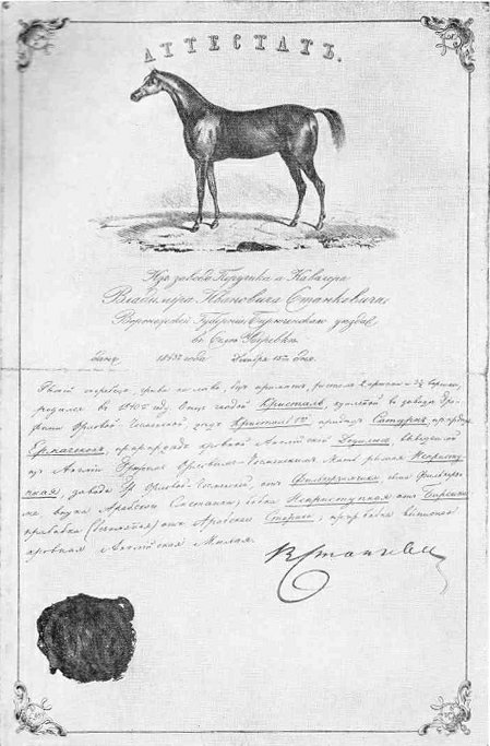 См. рассказ И. Д. Ознобишина о том, как в 1842 году барышник предлагал ему прибавить 250 рублей с тем, чтобы он умолчал в аттестате о жеребце Петерсе голландской породы.