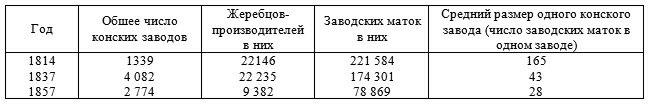 Внешняя картина расцвета частного коннозаводства к началу XIX столетия была поистине феерической. При чтении документов этой эпохи создается впечатление о своего рода гиппомании, охватившей широкие круги дворян-землевладельцев. Каждый богатый помещик считал для себя обязательным завести собственный конский завод, и эти конские заводы достигали в отдельных случаях исключительных размеров; например, в заводе К, Г. Разумовского считалось свыше 2 тысяч кобыл. Исключительно крупными были и заводы Шереметева, Апраксиных, Гагариных, Голицыных, Зубова, Гудовича, Чичерина, Полторацкого, Чорбы, Прозоровского, Пашкова, Муравьева-Апостола, Мосоловых, Черткова.