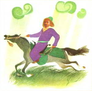 Подвели к нему прекрасного коня, вскочил он в седло и помчался быстрее ветра. Но вот на пути его вырос непроходимый лес. Натянул Карахан поводья, взмыл тулпар высоко-высоко и перелетел лес.