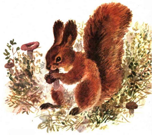 Белка — зверёк ловкий. Весь день с сучка на сучок, с дерева на дерево прыгает — где ягоду сорвёт, где еловую шишку. А наступит осень — тут белка на зиму запасы примется готовить. То грибы повесит сушиться, то орехи в дупло запрячет. Холодно, голодно зимой, вот и пригодятся белке припасы.