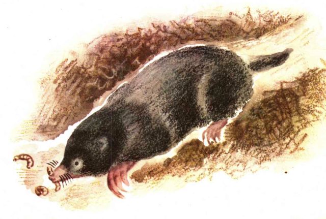 Сам крот маленький. Мордочка хоботком вытянута, а лапки будто вывернутые — такими лапками удобно землю рыть.