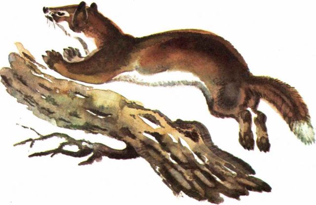Вот проковылял по чащобе, тихо похрустывая, заяц-беляк. Пробежала по краю осторожная лисица. Спрятался в норе под корягой быстрый хорёк.