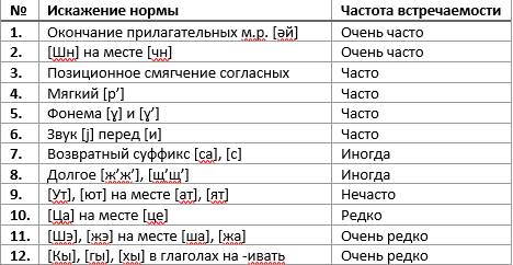 Как видно из таблицы, самым часто встречающимся искажением оказалось произношение окончания [əй] у прилагательных мужского рода, встречавшееся почти в каждой кинокартине. [Шн], как было описано в результатах исследования, употреблялось в узком наборе слов, что обеспечило данному искажению, так же как и мягкому [р’] и позиционному смягчению согласных, закрепиться в произношении определённых слов и, благодаря этому обстоятельству, остаться в активной речи актёрского состава. Самым редким искажением оказалось произношение [гы], [кы], [хы] на месте –ивать в глаголах, встретившееся буквально в нескольких фильмах.