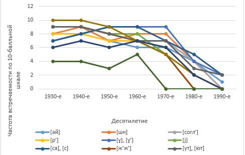 График составлялся из расчёта частоты встречаемости отдельного искажения в фильмах на каждое десятилетие, начиная с 1930-х (первый звуковой советский фильм «Путёвка в жизнь», режиссёр Н. Экк, был снят в 1931-ом году) и заканчивая 1991-м годом. Как видно из графика, прослеживается относительно общая тенденция спада встречаемого произношения, начиная с фильмов 1970-х годов. К 1990-му году практически завершилась общая унификация русского языка, закрепились единые нормы произношения по всей стране, и, таким образом, в этом периоде наблюдается закономерное снижение популяции различных диалектов, включая старомосковский.